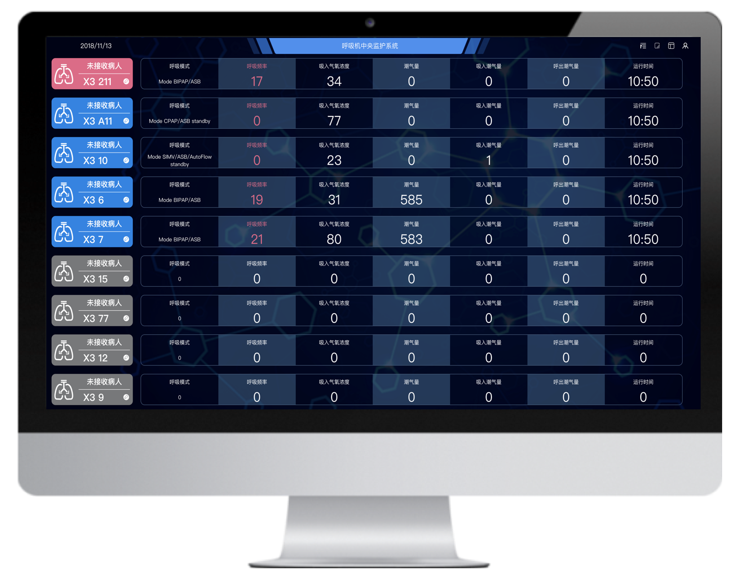 通過的最新的數(shù)據(jù)采集技術(shù)和網(wǎng)絡(luò)技術(shù)將多臺不同品牌的有創(chuàng)呼吸機(jī)聯(lián)網(wǎng),并通過大屏實(shí)時(shí)集中呈現(xiàn)治療預(yù)設(shè)參數(shù)和監(jiān)測參數(shù),實(shí)現(xiàn)多臺集中監(jiān)測、集中管理和數(shù)據(jù)存儲。